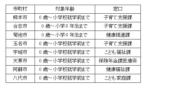 ※例:熊本県内 各市町村 対象年齢、窓口一覧(一部)